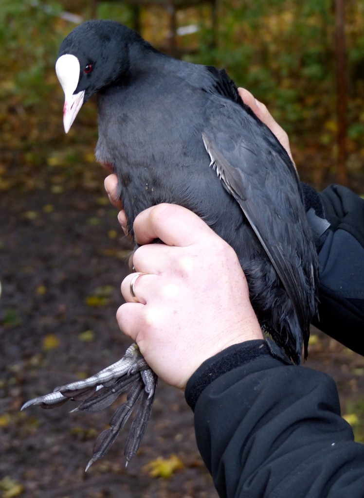 The photos are of the Coot which provided Jason Atkinson with a ringing “tick” this morning and the Robin which was looking on.