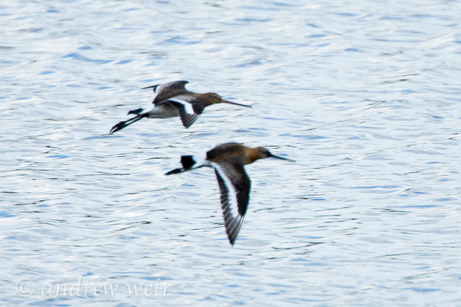 A not very good photo of two Black-tailed Godwit flying past the John Morgan Hide.