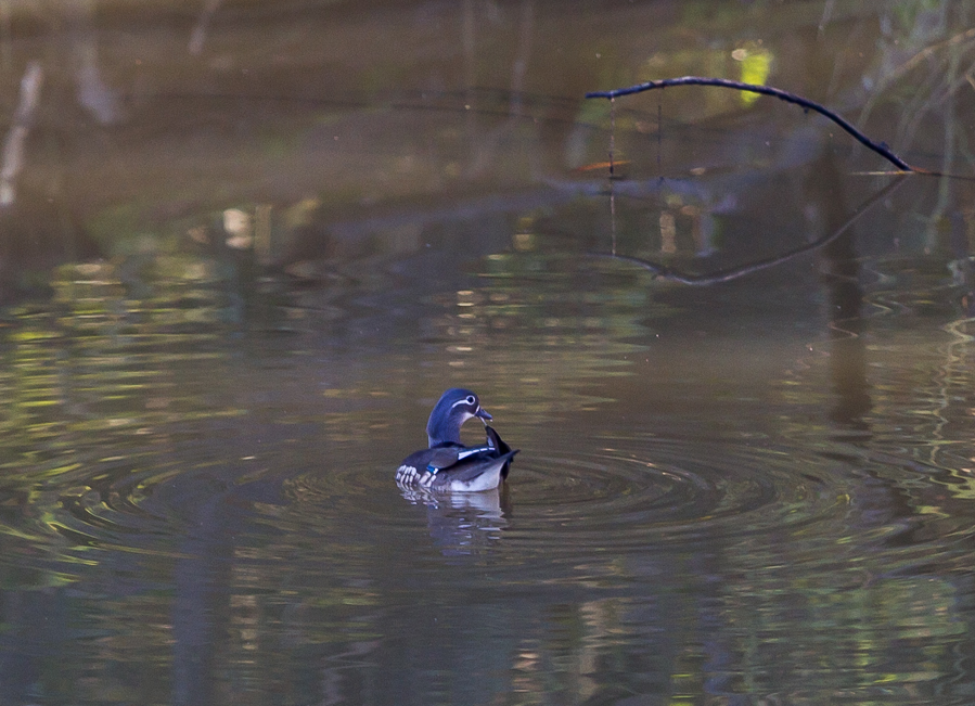 Warm and sunny Morning. Found this Mandarin to the East of the footbridge which quickly sought the overhanging trees in the corner to Roost, typically on a log. No sign of a drake, but excellent sighting of the Kingfisher in the same spot.