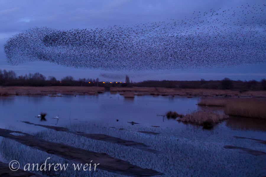 80,000 Starlings at tonight’s roost, along with 85 Pied Wagtails, 5 Black-necked Grebes, 2 Redshanks, 6 Sand Martins, 2 Ruddy Ducks, 2 Water Rails, 7 Little Grebes, 66 Shoveler and 5 Sparrowhawks.