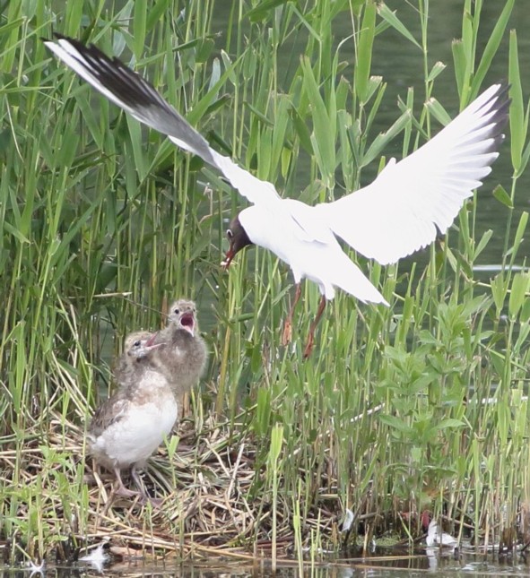 No.3 bed.Thorough survey of Black-necked Grebes found a minimum of nine broods with 16 adults and 10 young including one full grown independent juvenile.Adult Shelduck with 9 growing young. Pair of Greylag geese with 2 near full grown young and many Canada geese including 8 well grown young of various sizes.Despite many Black-headed Gull chicks having been taken by Lesser black backs during past month over 50 full grown juveniles on scrapes majority having fledged. At least 15 Broad-leaved Helleborines found though none in flower yet.