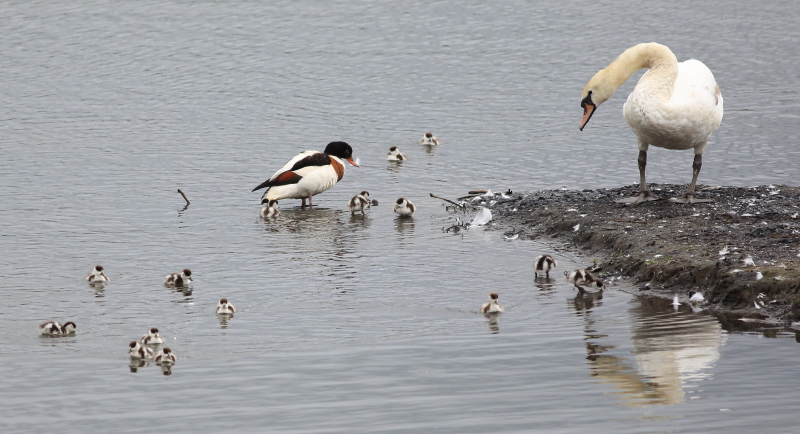 Shelduck with 16 chicks at end of island strip No 3 bed. The swan appeared to be regarded as no threat.