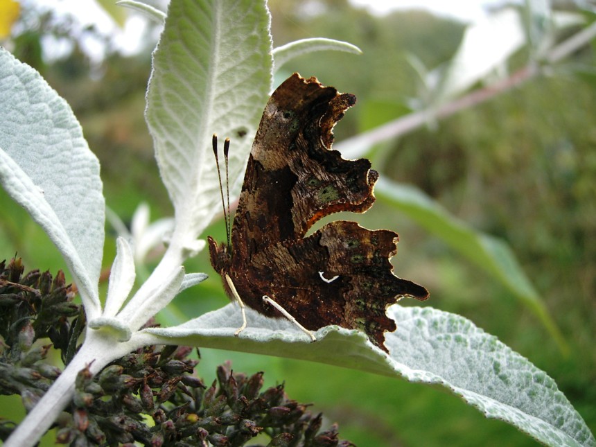 A count of Robins produced a total of 82 across the reserve. Magpies totalled 20 of which 15 were on or near No.4 bed. 23 Moorhen included 8 on No.3 bed which also held large numbers of Canada (207) and Greylag (52) Geese. Many of these were seen flying in from the east low over No.2 bed. 4 Wigeon were on No.3 bed and, more unusually, 2 were on the canal at the eastern end of the reserve. About 1000 Wood Pigeon were in the Butchersfield area, most on fields to the north. A Peregrine on the viaduct gave good views. In spite of the cloudy weather a Comma was on a Buddleia on the south bank of No.3 bed; see photo.