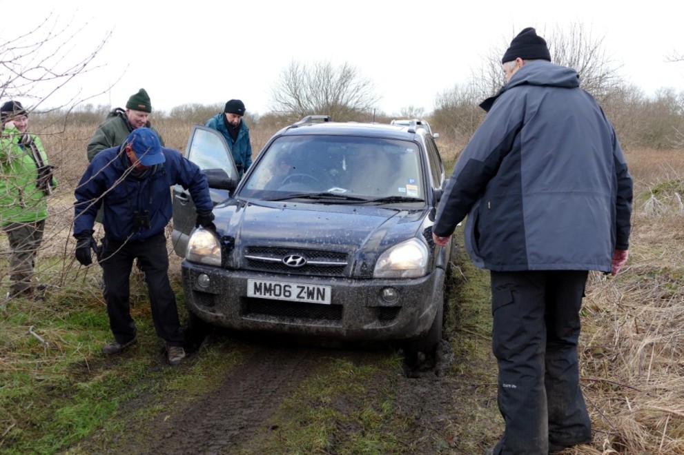 Another excellent morning on No.3 bed, followed by an “off-roading” trip to review progress on No.4 bed with the contractor. One of our party, Paul Hazlehurst, arrived early and was in the Morgan Hide before first light (making up for over-sleeping the previous week!). He got his rewards when a Barn Owl tried to join him in the hide, twice landing on the ledge a couple of feet way from him and thinking about coming into the warmth of the hide. Other sightings included: 1 Kingfisher, loads of Teal, 4 Pochards, 10 Bullfinches,2 Fieldfare, 22 Redwings, 27 Magpies, 8 Stock Doves, 5 Snipe, 1 Redpoll, 1 Tawny Owl, 108 Lapwings, 6 Shelducks and 18 Shovelers. The trip onto No.4 bed proved eventful, when David Spencer’s car got bogged down and had to be towed out by the contractor (see photo!)