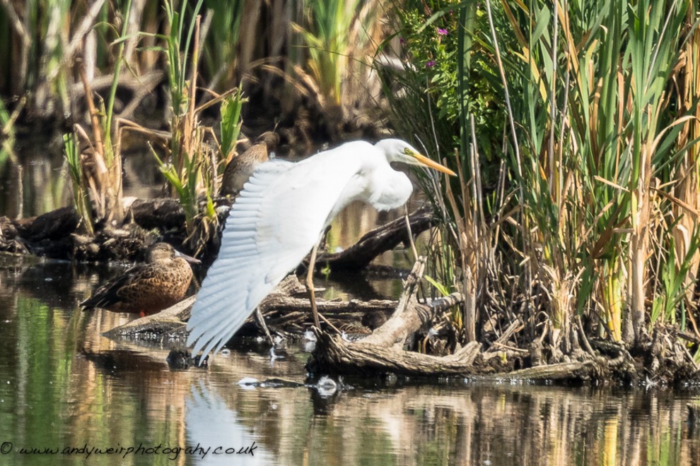 The Great White Egret showed well from the Frank Linley hide this morning. Also present were 2+ Green Sandpipers, 1 Greenshank, 13 Black-tailed Godwits and 3 Snipe.