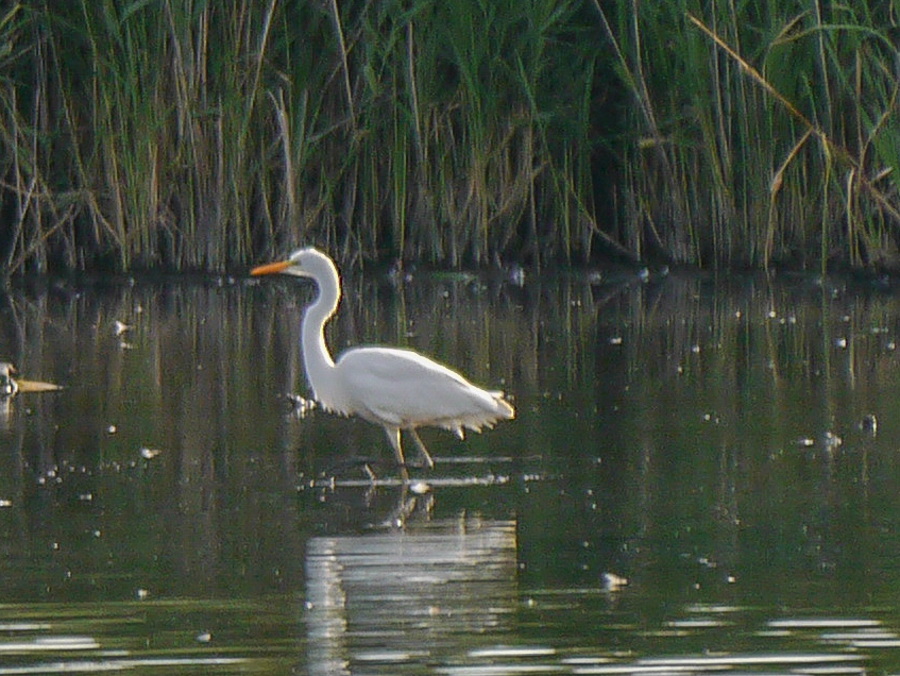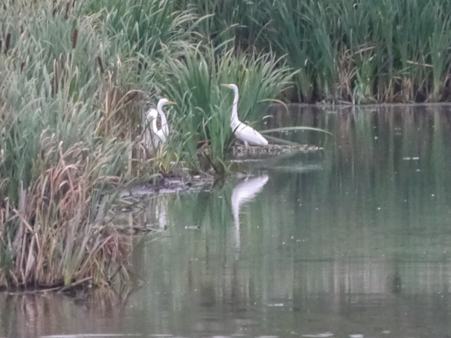 Two Great White Egrets were feeding along the north bank this evening. They flew off west at c20:15. On my way home a single bird was roosting along the east bank; possibly a third bird but it is difficult to be sure. The 2 Ruff were still present together with 16 Snipe and a Hobby hunting over the bed.