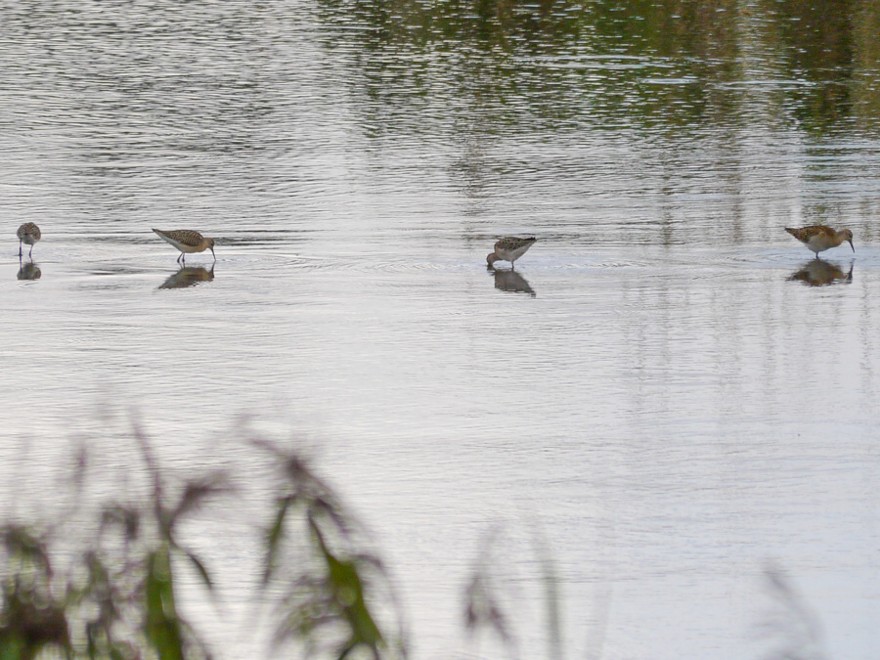 The low water level on No.3 bed continues to attract waders with at least 5 Ruff present this morning, the 4 in the photo were viewed from the tower hide. Other waders included 31 Black-tailed Godwit,9 Snipe,1 Little Ringed Plover and several Common and Green Sandpipers. A female Pintail was also a new arrival. Only one Great White Egret was seen, still feeding along the north bank. Yesterday evening 6 Swift and a calling Green Woodpecker were of note.