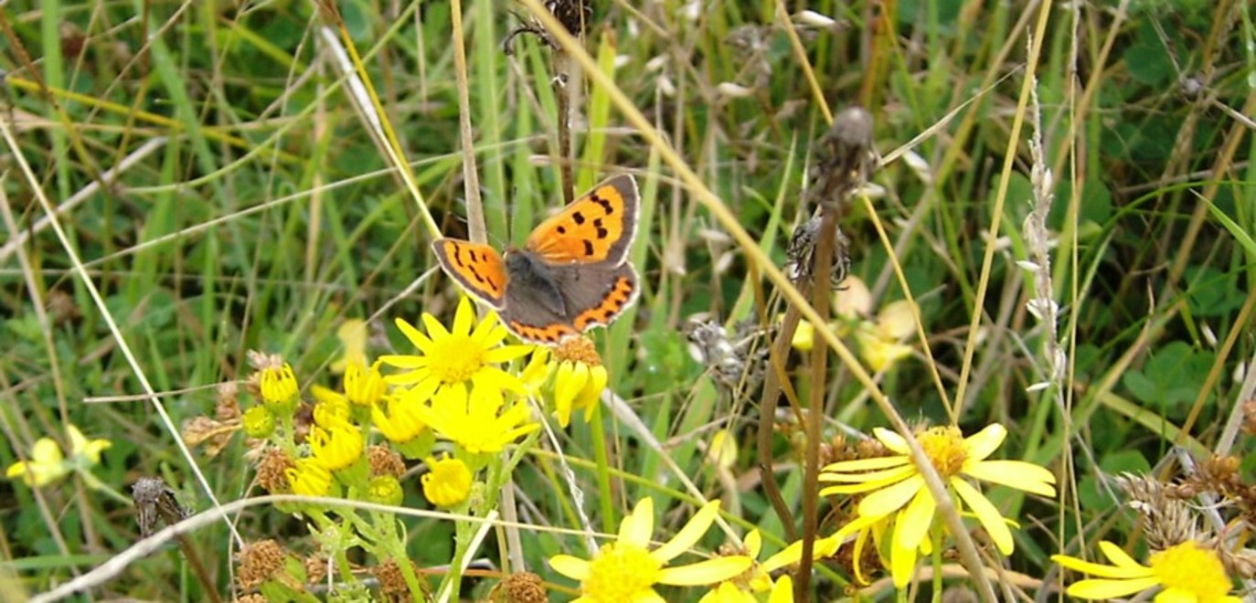 A fine morning and I managed to cover No.1 bed and Butchersfield Tip before cutting short my walk as a result of a thunderstorm just before noon. Two Grey Partridge and a Hobby were on the tip and butterflies were still fairly numerous with 38 Speckled Wood, 31 Meadow Brown, 7 Common Blue and 4 Gatekeeper. Just before the rain arreived I found a Small Copper on No.1 bed - see photo