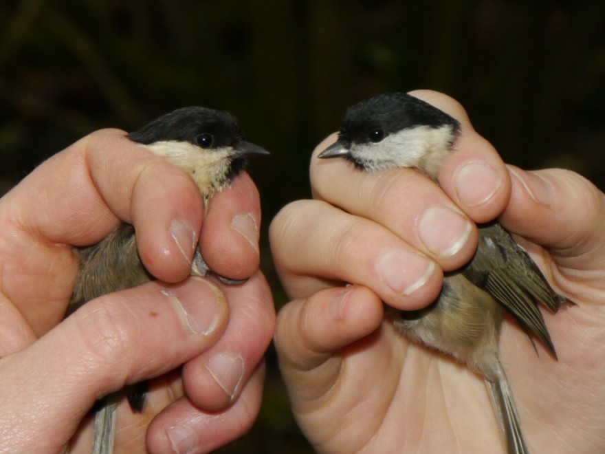 The Marsh Tit was still regularly visiting the John Morgan hide feeders this morning. It favours the feeders on the left hand (westerly) side of the hide. It is ringed on the left leg, any Willow Tits with rings will be ringed on the right leg. It is at times associating with a Willow Tit and both were caught on Saturday, see photo (the Marsh Tit is the right hand bird).