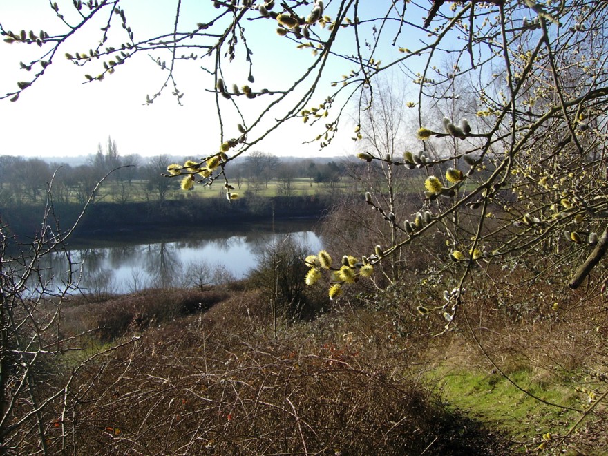 In spite of a cold start it was a beautiful late winter’s day. The water level on the canal and river was very low, possibly as a result of work being carried out at Latchford Locks. Many common birds were in song including Chaffinch, Greenfinch and Dunnock with the latter plentiful although I did not do a count. An early Bumblebee was active on Butchersfield Tip. Pochard totalled 80, my highest count of the winter; nearly 300 Tufted Duck were present and 21 Greylag Geese at Bollin Point. On No.3 bed were about 260 Black-headed Gulls. Photo; Willow catkins on Butchersfield Tip looking towards Lymm Golf Course.