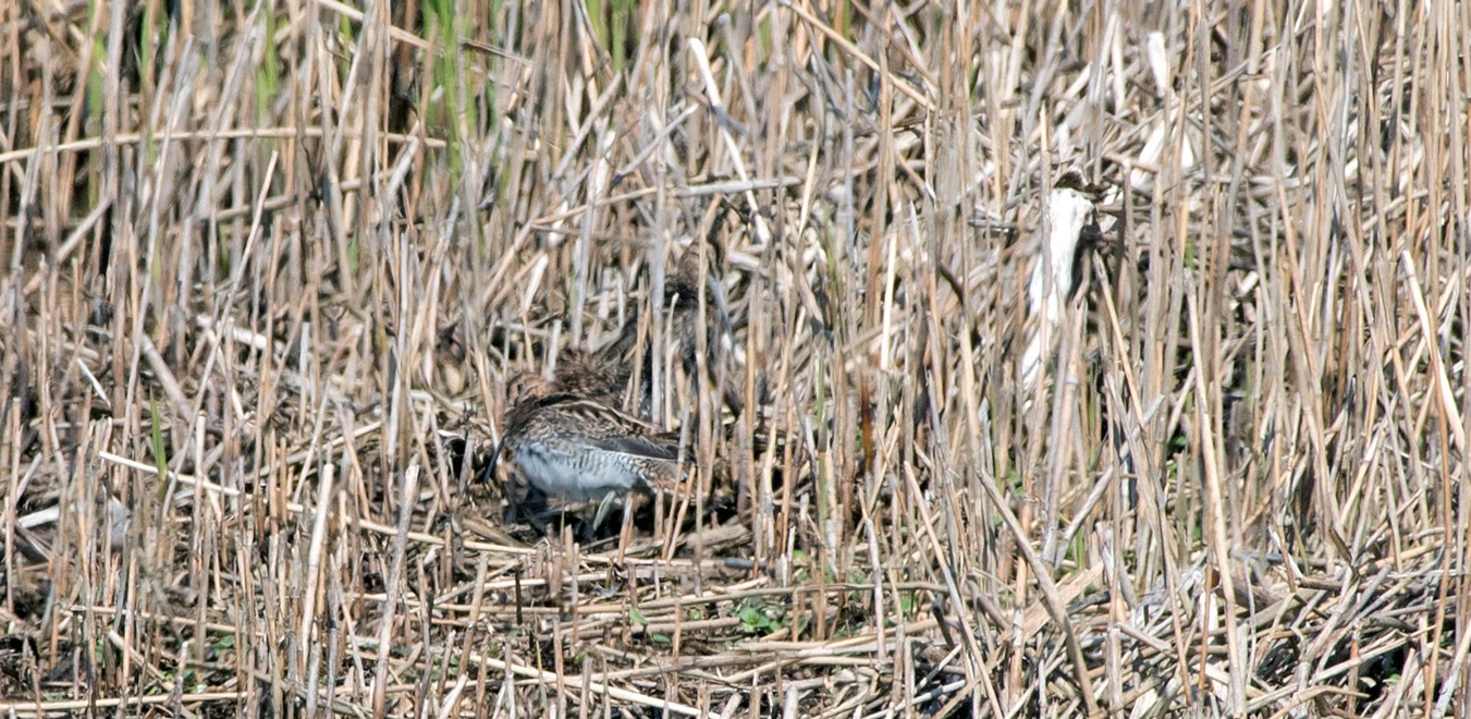 A pair Snipe hiding in the reeds to the right of the screen by the Sybil Hogg Hide