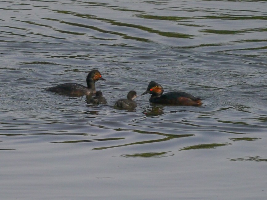 2 Green Sandpiper and 1 Black-tailed Godwit were present this evening. Also 2 Whimbrel flew east over the bed. At least 4 juvenile Black-necked Grebes were still being fed by their parents, including this pair.