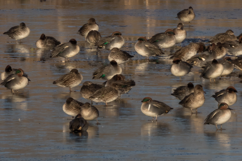 At the moment Woolston Eyes is the gift that keeps on giving. We’ve all worked hard this year and been rewarded with 156 species, before this morning, including such goodies as White-crowned Sparrow, 5 Yellow-browed Warblers, 3 Siberian Chiffchaffs, 2 Firecrests, Ring Ouzel, Bittern, Goshawk, Osprey, Red Kite and Hen Harrier. Sitting in the Morgan Hide this morning, with beautiful sunlight reflecting on the largely iced-over lagoon, I was musing that it’d be unlikely we’d find anything else new before year end. I then did a quick count of the 475 Teal out on the ice and challenged Colin Wells and his RSPB team to have a stab at estimating the number. Colin, being Colin, started to carefully count the flock, pausing only to say “I think I’ve got a Green-winged Teal out there”. He certainly did, too. So, that’s our 157th for the year and only the third ever at Woolston, the last being in 1987……and there’s still a month or so to go.