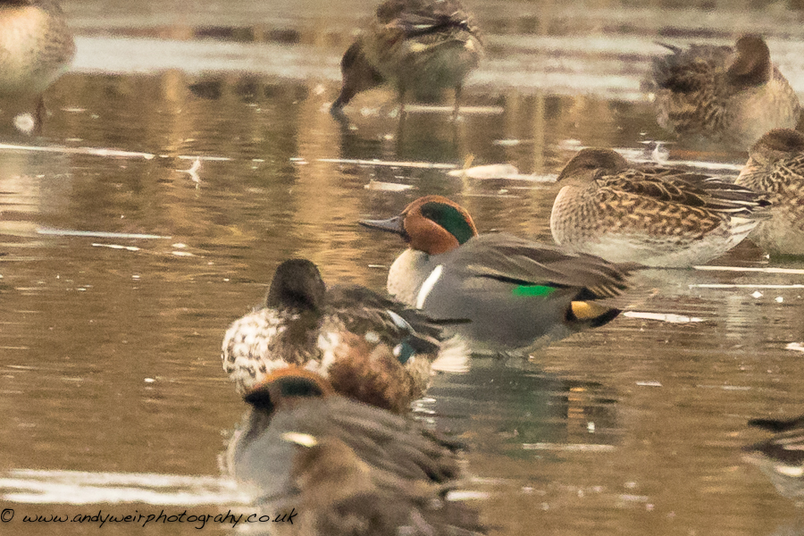 Record shot of the Green-winged Teal (Anas carolinensis) seen this morning from distance amongst a huge flock of Teal opposite the John Morgan hide.