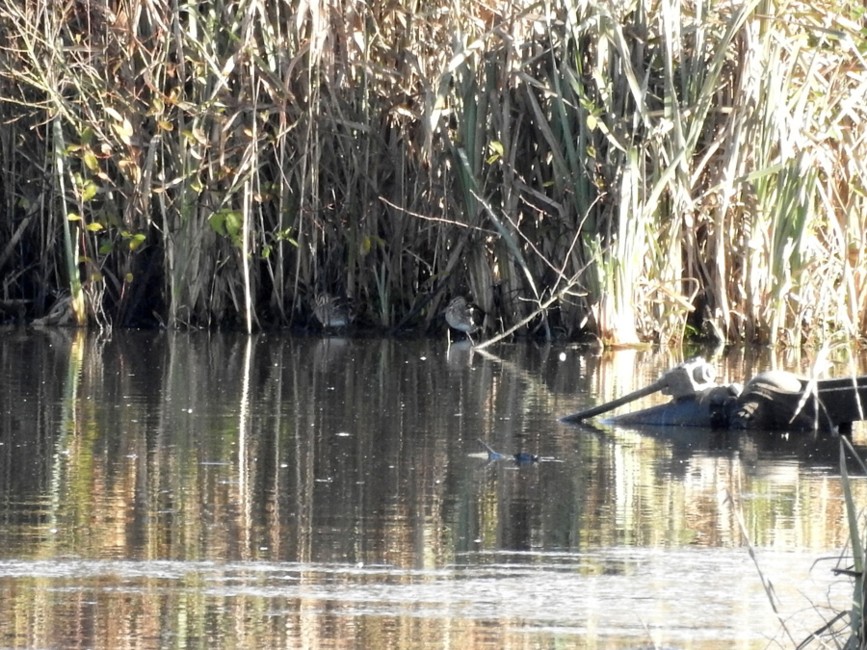 Great couple of hours at the eyes today cold but sunny.Number three bed was partly frozen however we saw three snipe over by the submerged digger as the distant picture shows.A few teal shovelers pochard and the odd wigeon.Under the feeder there was a young fox picking a few bits off the floor by the time I got my camera it had gone.There was a male bullfinch on the tree by the feeder quite a lot of greenfinch ,a willow tit and chaffinch.Gill saw finches on the sunflower field willow tits and chaffinches also plentiful also three goldcrest in a nearby tree.On the way out three thrushes and four wrens lots of blackbirds feeding on the berries.A great day out Roger and Gill