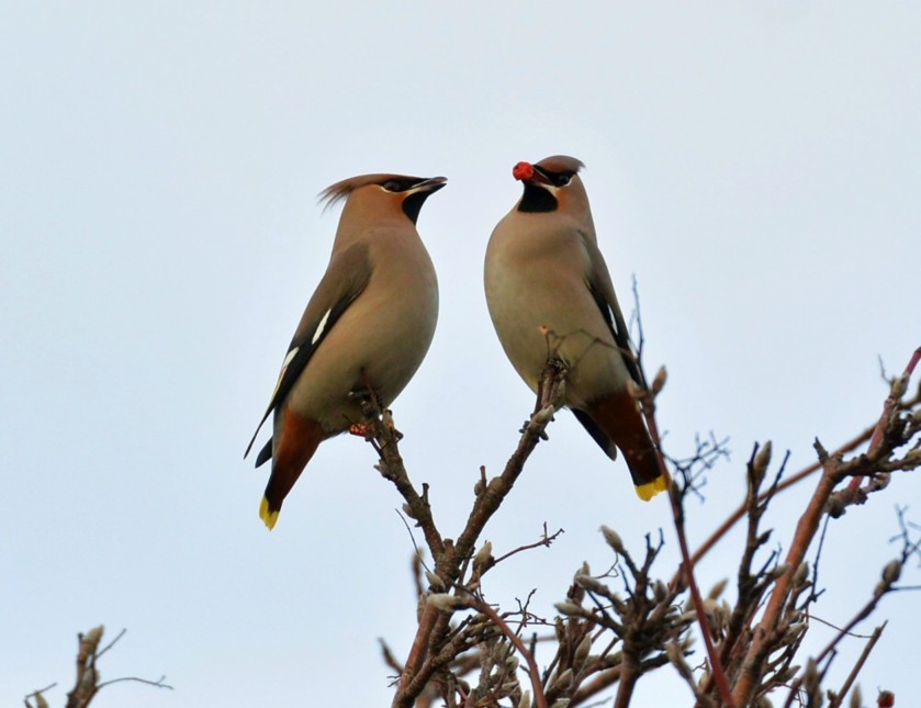 An early start on No.3 bed found 1,200 Teal working hard to keep a small pool open on the lagoon. A Peregrine stooped to try and flush them, so it it could take one in the air, but without success. By late morning, after making some common bird counts, George and I were itching to go and re-find some of the Warrington Waxwings. We didn’t have much time but did manage to locate a handful at Milner St. The main flock has clearly found an alternate source of berries, for the moment at least. While the photo isn’t great and isn’t from Woolston, it does show two juveniles presumably practising courtship feeding, which might tempt people to go looking for them while they’re still around - well worth it.!