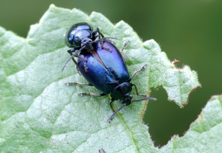 Photo of a mating pair of Alder Leaf Beetles from this morning.