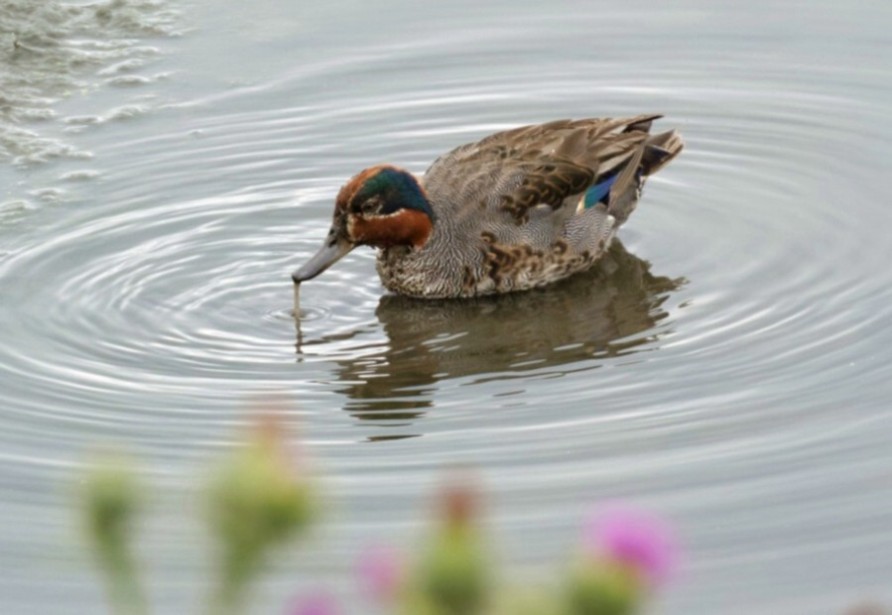 Photo of a moulting drake Teal from in front of the Morgan Hide