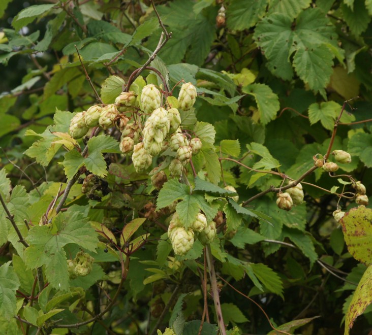 Photo of female flower cones of Common Hop,Humulus lupulus from No.2 Bed yesterday, 20th September. This particular plant has now spread over quite a large area of bramble and elder shrub.