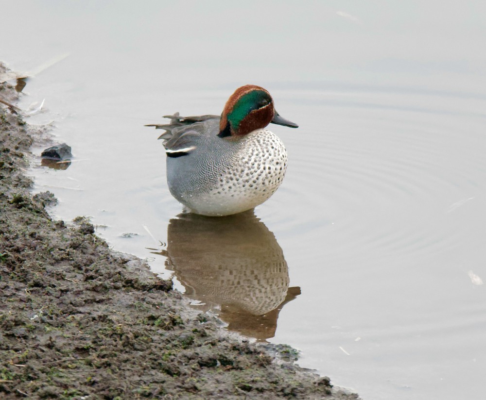 On a grey day with a persistent fine drizzle, we did most of our survey work from the Morgan Hide, though we did do a leisurely circuit of the bed during a brief break in the weather. Additionally, we gave Kieran Foster a hand with his wildfowl ringing programme, when he made an excellent catch of 31 Teal in the duck trap. His team’s work is providing supporting evidence for the view that it hasn’t been a good breeding season for Teal up on the northern tundra. On the way home I stopped off at the Weir basin to count the wildfowl and take a handful of shots with my new camera. Highlights of the day were probably the finches and the wildfowl, with counts of: 49 Bramblings, 6 Linnets, 3 Siskins, 15 Goldfinches, 21 Bullfinches, 90 Greenfinches, 60 Chaffinches, 4 Goldeneyes, 11 Pochards, 190 Tufted Ducks, 9 Shelducks, 21 Gadwall, 43 Mallards, 19 Shovelers, a displaying pair of Great Crested Grebes and 350 Teal. Other odds and ends included: 1 Cetti’s Warbler, 4 Snipe and 16 Redwings.