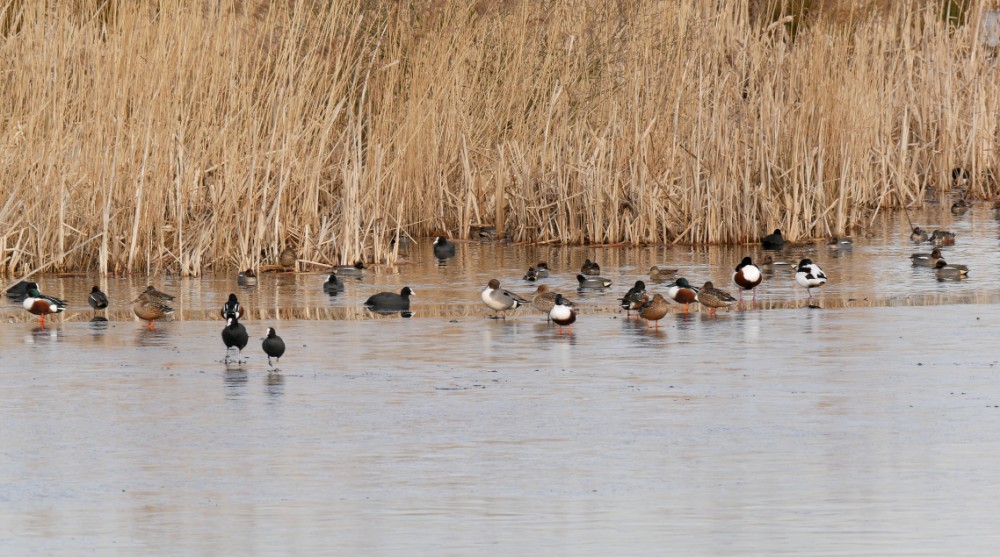 A fine, but very cold, morning with a heavy frost. Large parts of No.3 bed frozen but sufficient open water to concentrate the wildfowl in front of the Morgan hide.A very good gathering of Shoveler,81, with also 12 Shelduck and 45 Coot. Many Teal were calling and 12 Pochard. Unfortunately, there was no sign of the Marsh Harrier which had been showing well in the previous two days.