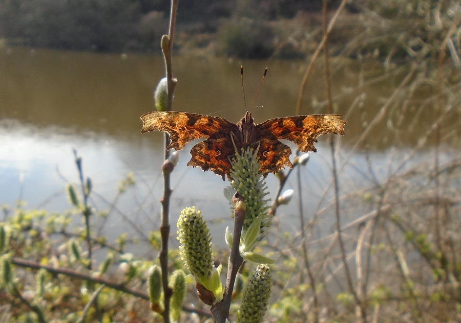 A surprisingly warm day with the temperature reaching 19 degrees by midday. Spring migrants have already arrived and the 3 Black-necked Grebes were still on No.3 bed together with the Little Gull which has been present for nearly a week. Good numbers of butterflies were on the wing - 12 Peacock, 7 Small Tortoiseshell, 3 Comma and 3 Brimstone were all well above average for mid-March. Other counts of interest were 18 singing Chiffchaff, 4 Cetti’s Warbler at the eastern end of the reserve, 239 Tufted Duck and 59 Canada Geese. A Raven flew north over No.1 bed. An interesting report from a member of the public was of a singing Skylark over the fields to the north of No.1 bed. Photo; Comma by the river