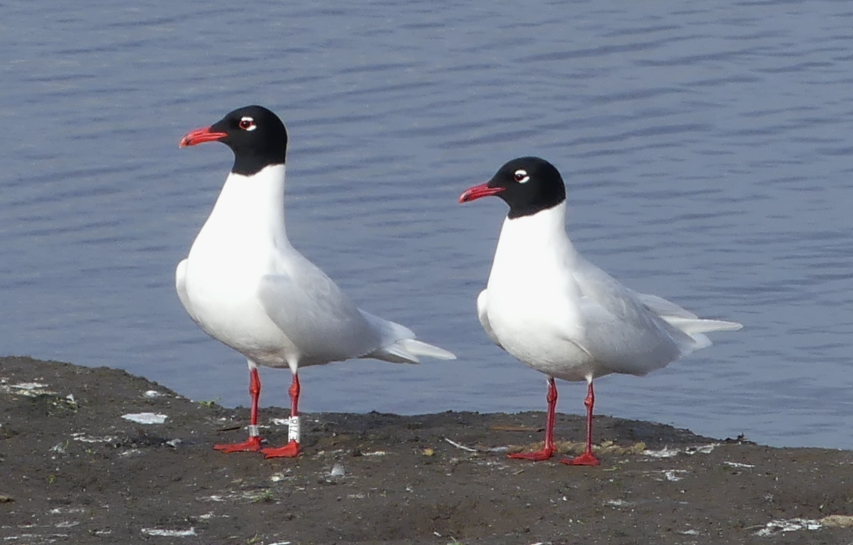 Yesterdays pair of Mediterranean Gulls were still present today, one of which is wearing a white darvic ring (code E718). It was ringed as chick in the Netherlands in 2012. Subsequently being seen in a number of other places, just showing how much these birds can move around, details below: