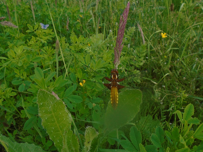 A morning survey of the northern section of No.1 bed yesterday produced a total of 66 Common Blues and 4 Meadow Browns, the first of the year. Also present were a Large Skipper and a Broad-bodied Chaser. This morning a Banded Demoiselle was on the Canal Track. Photo; Broad-bodied Chaser and Common Blue