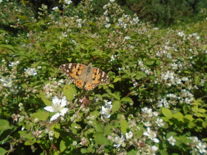 At last a hot summer’s day for my weekly walk round the reserve. The 2 juvenile Peregrines were sitting on the viaduct and on No.3 bed were a minimum of 63 young Black-headed Gulls, some pestering their parents for food! In recent weeks there has been an influx of Painted Ladies and today’s count of 19 was the highest at Woolston for ten years. Meadow Browns are now plentiful at the eastern end of the reserve and over 120 were present together with the first Small Skippers of the year. The first brood of Common Blues is now well past its peak but nine were found today. Photo; Painted Lady on the canal track near the car park.