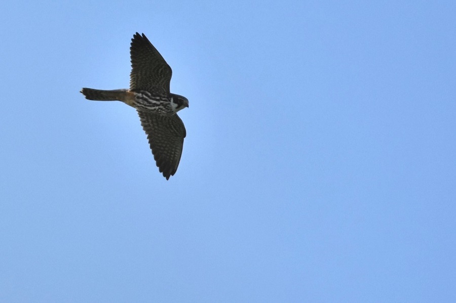 First-summer Hobby over the loop of No.4 this morning. The bird is aged as a first-summer due to the ochre, rather than orange, undertail as well as pale tips to the primary coverts which aren’t shown on this picture.