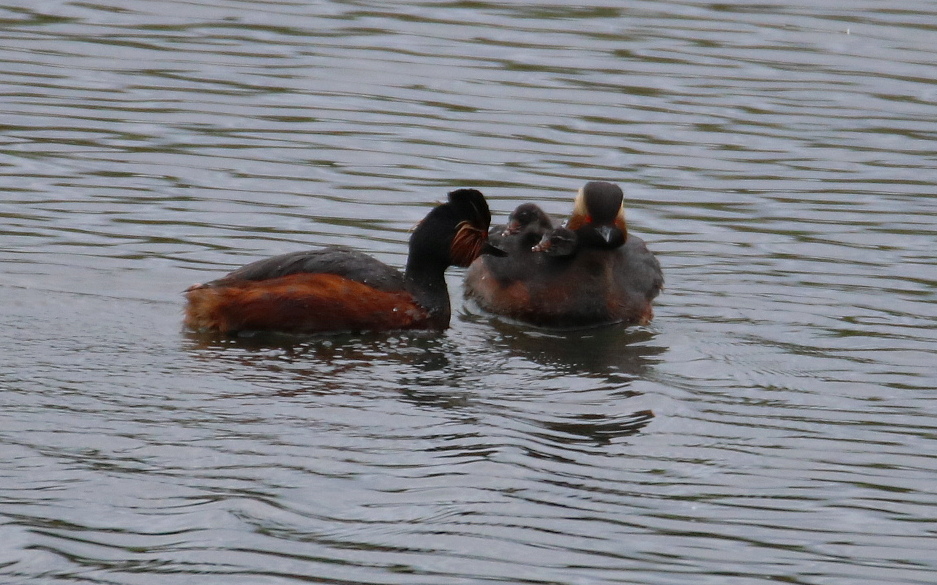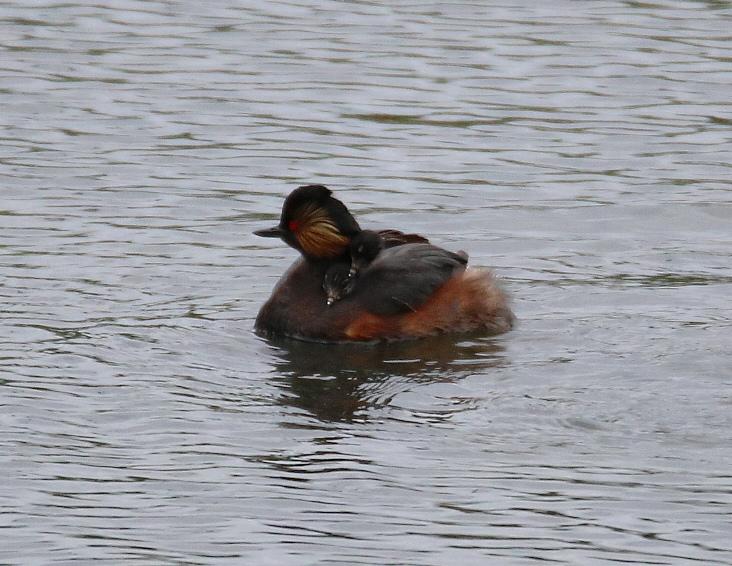 Here is a link to a short video of this weeks events. It shows the resident Peregine pair at their nest site, a pair of Oystercatchers which dropped in to bathe, a marauding Lesser Black-backed Gull predating a Black-headed Gull chick, the local male Peregrine flying over carrying a Blackbird and last, but very certainly not least, close-ups of our first Black-necked Grebe brood being fed on their parent’s back.