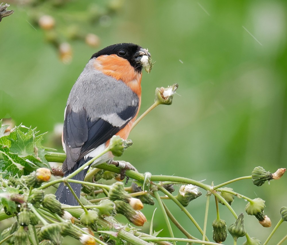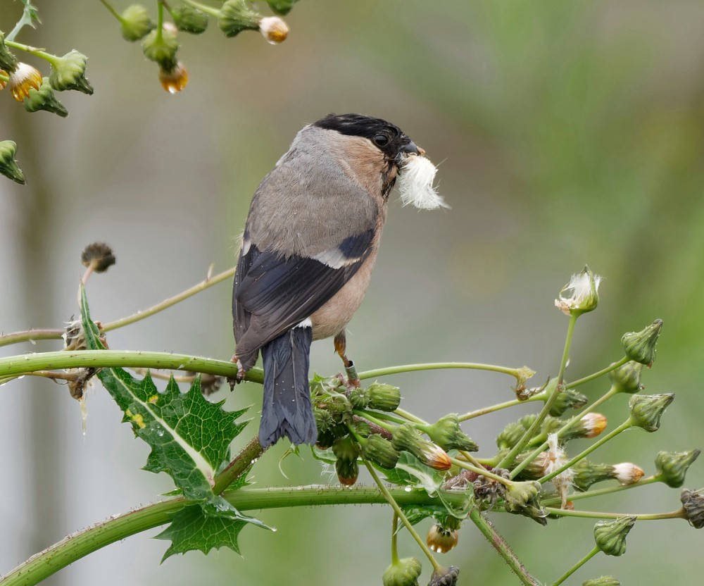 It was cold and drizzly this morning, so it was mainly about looking for broods from the Morgan Hide, before some of us stayed on and went down to No.1 bed to check on progress with the resident Peregrine pair. After yesterday’s excitement, with Daniel Owen finding a brood of Garganey (only the third ever for Cheshire and the first since the mid 1970s) the focus was on looking for more Black-necked Grebe, Pochard, Shoveler and Teal broods. The pair of Black-necked Grebes around the South Pool still have two young on their backs, while another pair was watched carrying vegetation into a likely nest-site. Others are scattered around the bed and we remain hopeful of more young in the immediate future. We managed to locate one new brood of Pochard, our twelfth of the season so far. Shoveler and Teal remain more enigmatic, with skulking males and pairs but, as yet, no young spotted. The gloomy weather brought down 90 Swifts, 18 Swallows, 15 Sand Martins and six House Martins. A Hobby then stooped in to catch and then flew west with its prey. The day ended with lpeasing confirmation that the Peregrines have two well-grown, partly feathered young. Photo of a male Bullfinch Cheers David Bowman (with David Spencer, Helen Wynn, Daniel Owen, Diane Shepherd, Sue Haddock, Brian Martin, Alan Warford, Les Jones and Brian Baird)