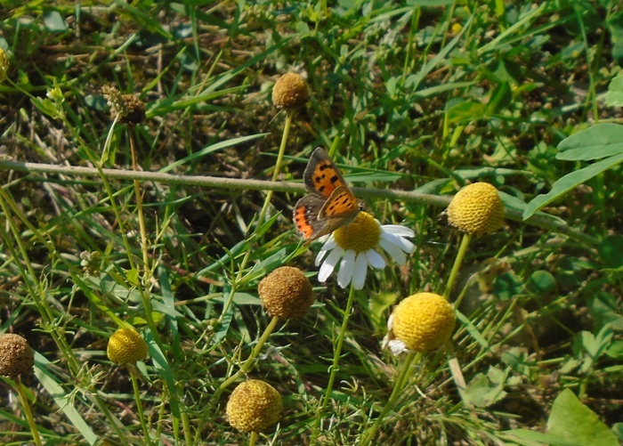 A lovely hot late summer’s day and plenty of butterflies on the wing on the northern half of No.1 bed. The highlights were 64 Painted Ladies, 49 Common Blues and 42 recently emerged Small Tortoiseshells. 39 “Whites” were thought to be all Small Whites. To add to the variety there were singles of Large White, Small Copper and Holly Blue. Photo; Small Copper
