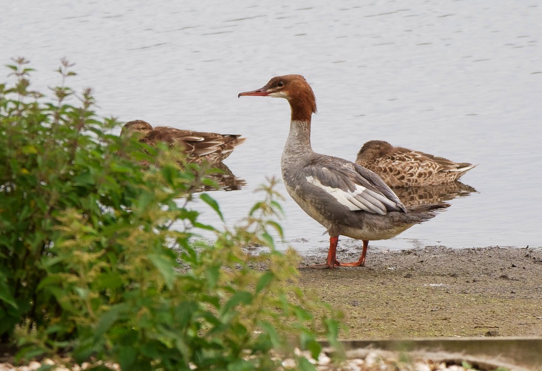 On an overcast day, with a light south-westerly breeze blowing, we managed to gather some nice sightings. An early morning walk around No.1 bed was pretty quiet but things picked up when we arrived on No.3 bed, where we were met by a passing Hobby. A juvenile Goosander on the Morgan Hide scrape was a nice surprise as they are very scarce there. Three Green Sandpipers, two Black-tailed Godwits and 340 Lapwings were the only wader sightings, all of which were flushed by one of the local juvenile Peregrines, which made several fast, low level passes without threatening to catch anything. As ever, one of the local Kingfishers posed well and a juvenile Great Black-backed Gull was with the 48 Lesser Black-backed Gulls on the water. We then concentrated on counting the passing Swifts and hirundines with totals of: 160 Swifts, 65 Swallows, 15 Sand Martins and 2 House Martins. A bit less welcome was the arrival of the local feral goose flocks, totalling 99 Greylags and 52 Canadas. Photo of today’s Goosander Cheers David Bowman (with Dave Steel, David Spencer, Daniel Owen and Danny Gornall)