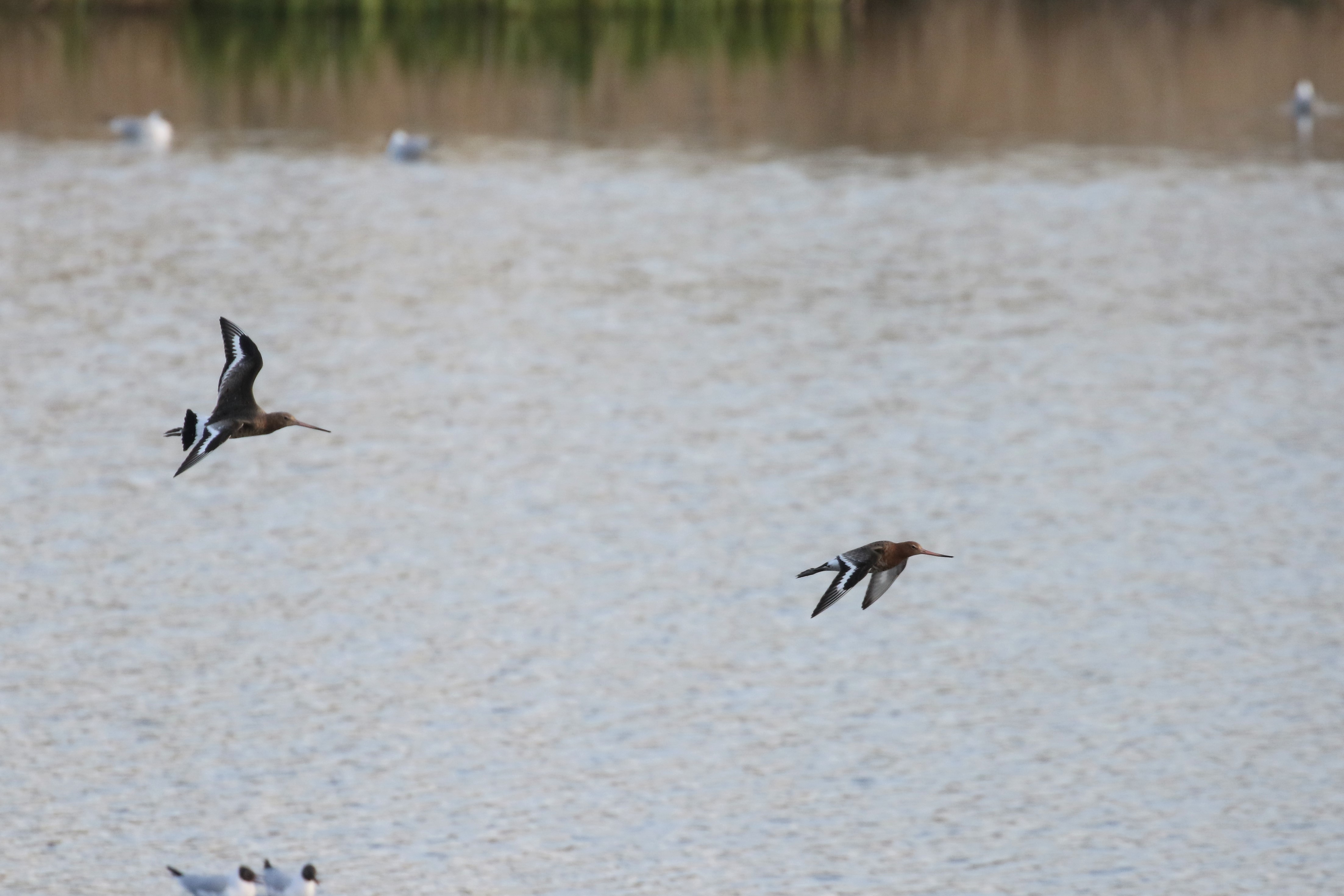 Two Black-tailed Godwits that flew around the bed on today. The Black-necked Grebe count is now up to 10 birds.