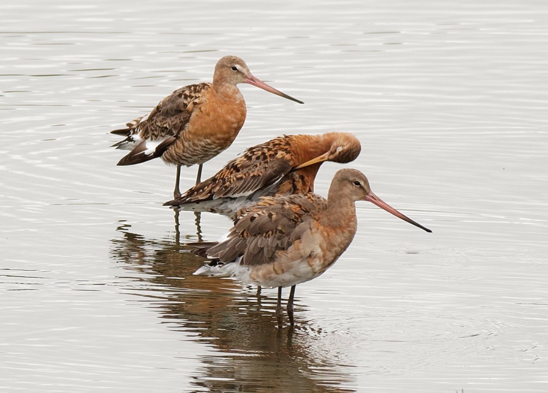 On a warm, still day on No.3 bed, where not much seemed to be moving, we gradually accrued a decent number of interesting sightings. Early on, two Green Sandpipers, three Black-tailed Godwits and 30 Lapwings (mainly juveniles), were on the Morgan Hide scrape. Notable by their absence were the masses of juvenile Lesser Black-backed Gulls which have been a raucous feature of the bed recently. Two Ravens then flew east, before two more Green Sandpipers appeared, perching on one of the nest rafts, and three more Black-tailed Godwits dropped in. Of the local breeding birds, Kingfisher, Water Rail and Willow Tit were all viewable from the Morgan Hide. Another Green Sandpiper made five for the morning, just two of which were ringed. So, with six having been ringed over the week, at least nine individuals have been present on the bed this week. Swifts trickled south all morning, with just over 200 counted and a Hobby, as ever, was soaring over the east bank of the bed late on. Photo of some of the Godwits Cheers David (with David Spencer)
