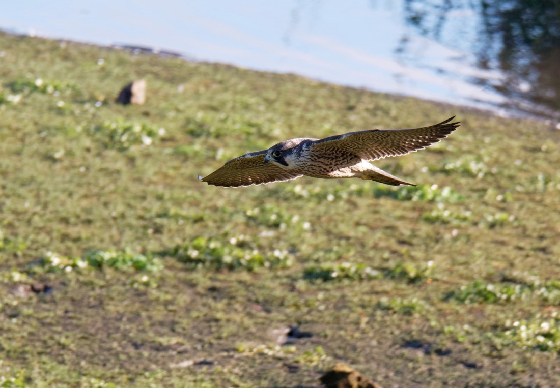With blue skies and with a light but cool northerly breeze, it looked good for migration on No.3 bed at Woolston Eyes, though in the end a couple of close encounters with our resident predators provided the day’s highlights. Redwings were moving from the start, with around 100 counted by the end of the morning. From the Morgan Hide, Goosander and Pintail were good records for the bed. Then a juvenile male Peregrine came in at high speed, heading straight for the hide. Twice recently I’ve seen this male try to grab a Moorhen from the scrape and narrowly fail. This time it managed to snatch one, landed on the scrape and was in the process of dispatching it when a Buzzard and a Sparrowhawk arrived to mob the falcon. Leaving its prey, the Peregrine vigorously drove the rival raptors away but when it came back, to both our surprise, the Moorhen was gone . The last hour was spent sitting on the steps of the hide, looking west for a raptor watching session. Highlight of this was a small passage of 14 Common Buzzards, tracking south-east at height, something I’ve only seen here once before. Photo of the Peregrine Cheers David