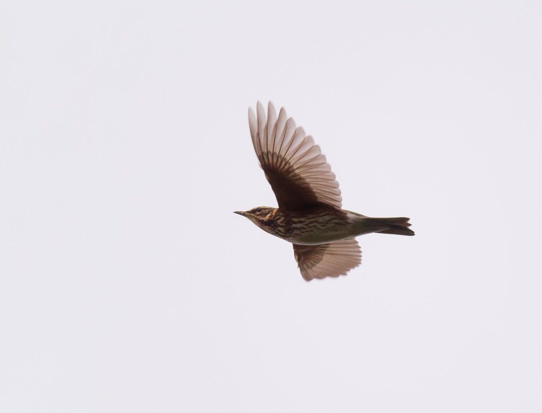 A couple of hundred Starlings left a roost at dawn, followed by 400 Woodpigeons before a nice thrush movement started. Small groups of 110 Redwings were first, followed by three Fieldfare flocks totalling 250. A walk round the bed produced more feeding Redwings and Fieldfares, along with 50 Blackbirds and 13 Song Thrushes, some of which were also likely to be continental migrants. Other sightings of note included a Stonechat, a Pink-footed Goose and 4 Wigeon, all on the Morgan Hide scrape. Photo of a passing Redwing Cheers David Bowman (with David Spencer)