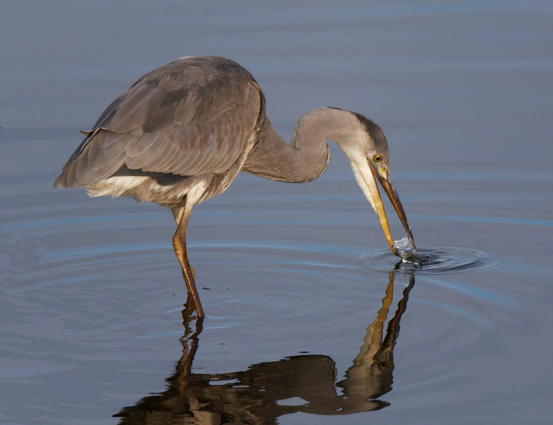 Iit was exciting to find 250 roosting in front of the Sybil Hogg Hide before launching off to head east, presumably to feed on local stubble fields. With the Pink-feet was a larger goose, which we suspect might be the White-fronted Goose which has been seen, locally, feeding with Pink-feet. Then, from the Morgan Hide, we were treated to a Water Rail, a couple of Lesser Redpolls feeding on Mugwort, a male Brambling, a male Peregrine trying to catch Woodpigeons and another 600 Pink-feet flying eastward. The prospect of the Pink-feet returning to roost in the evening tempted me to stay till dusk, when I was re-joined by David Spencer. Between us we counted in 180 Pied Wagtails and 300 Starlings into their respective roosts, with a Peregrine snatching one of the latter but no geese. Reaching the car park, however, in almost complete darkness, we heard a mass of Pink-feet arriving to drop in to the bed. Photo of a Grey Heron catching a fish Cheers David