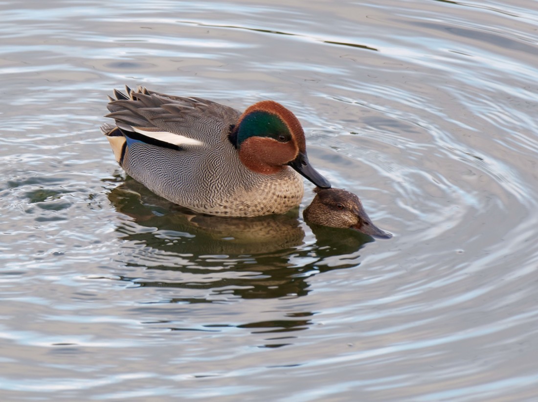 After a very drizzly Wednesday, it was good to arrive at dawn this morning to a cold but clear sky. Noticeable on arrival was the absence of any Pink-footed Geese leaving the No.3 bed roost. They either left much earlier than recently, due to the clear skies, or they’ve moved on to pastures new. Hopefully the former. A couple of thousand Woodpigeons moved south soon after dawn, 650 Starlings left their reed-bed roost and a few Redwings and Fieldfares also passed over. Highlight of the day, though, was watching the well-marked female Marsh Harrier, which has been a regular visitor over the late autumn/winter, hunting the 800 or so Teal around the bed. A wintering Chiffchaff was caught and ringed and a pair of mating Teal was an unusual sight, so far ahead of the breeding season. Photo of the mating Teal Cheers David (with David Spencer and George Dunbar)