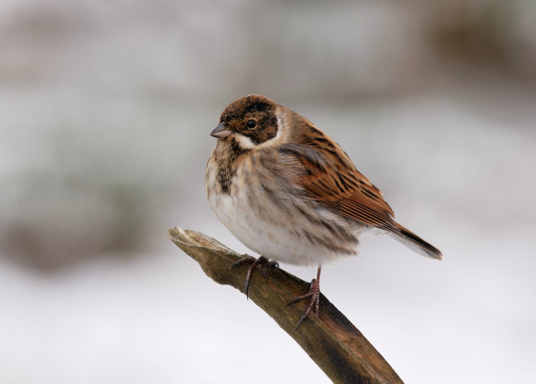 I started onto No.3 bed in the midst of a dawn snow flurry. Cold spells often bring hard-weather movements of birds, so it was eyes peeled all morning. First arrivals were 12 Wigeon and 5 Goosanders, which circled the frozen lagoon before seeming to drop onto the deeper waters of the Oxbow. The Morgan Hide feeders were alive with birds, with many more seed-eaters feeding around the bed. Totals included: 4 Bramblings, 1 Siskin, 200 Greenfinches, 10 Bullfinches, 75 Goldfinches, 80 Chaffinches and 12 Reed Buntings, though these are all likely to be minimum counts. Walking round the bed, a Woodcock flushed and the odd Redwing was with the more numerous Blackbirds and Song Thrushes, while two Cetti’s warblers were calling. Unusually for No.3 bed, 15 Meadow Pipits were feeding in the seed crop, with another in front of the Morgan Hide. The icy conditions also delivered views of two Water Rails, while a Kingfisher zipped over the ice, looking for a place to fish. I ended up with 60 species seen, which isn’t bad for the time of year. Photo of a Reed Bunting Cheers David