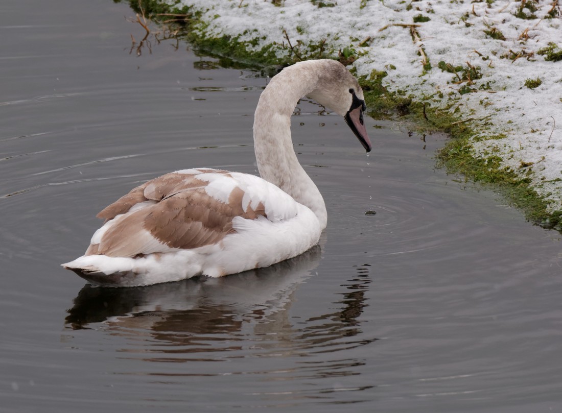 Conditions this morning at Woolston Eyes moved from a blizzard-like dawn to bright sunshine by lunchtime. The abiding memory will be of the 60,000 Starlings rising out of their overnight roost with a deafening whir of wings. Out on the water, 41 Pochard, 3 Wigeon and 150 Teal were braving the conditions, while masses of finches, including at least 14 Bullfinches, were squabbling over access to the Morgan Hide feeding station. Several Sparrowhawks were attracted by the density of potential prey, including the juvenile male which still hasn’t learned that sitting just above the feeders isn’t the best way of ambushing a wary finch. Other sightings of note included two skeins of Pink-footed Geese, totalling 550, and 8 Snipe which dropped in. Photo of a juvenile Mute Swan Cheers David