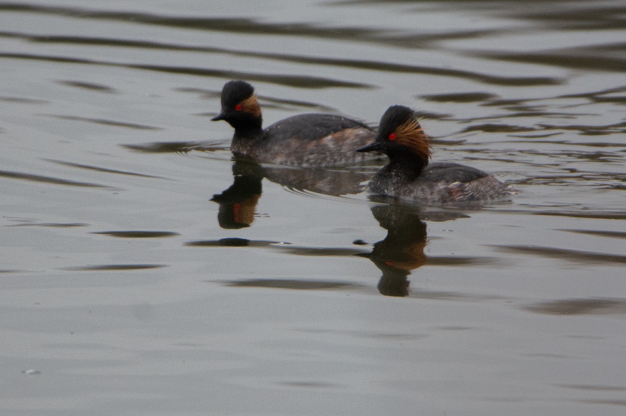 Another beautiful early spring morning on No.3 bed at Woolston Eyes, with the light southerly breeze gradually breaking up the cloud cover as the day warmed. A pair of Black-necked Grebes were initially in front of the Morgan Hide, though they were very mobile, sailing around the bed exploring the reed beds for a suitable nest site. These early-returning birds settle down to nesting pretty rapidly, so that, if the weather is kind, they can produce two broods before leaving in late July. We couldn’t locate the single grebe, which was present on Thursday, which we presume has moved off, at least temporarily. This is the time of year when the first spring migrants cross paths with our winter visitors and the single Woodcock, 15 Redwings and 2 Wigeon we noted will soon be thinking of heading back to their breeding grounds. Other reports of note included a Redshank, three Lesser Repolls and from the new No.4 bed wetland, 15 Snipe and two trilling Little Grebes. Photo of a female Gadwall Cheers David Bowman (with Helen Wynn and Dave Steel)