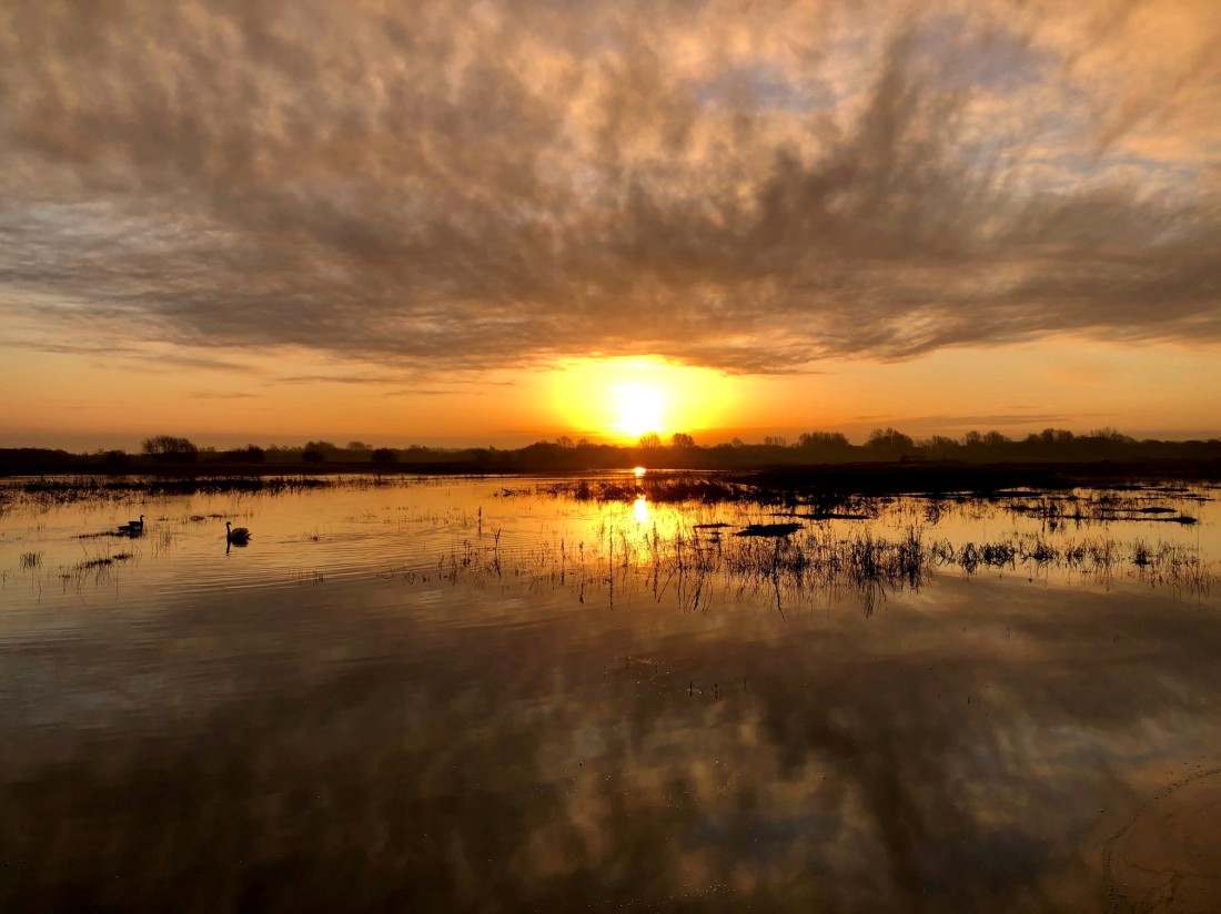 As I was walking onto the new No.4 bed wetland, for a review meeting with our contractor, the sun was rising in spectacular fashion. Calling Redwings drew my attention to 135 of these smart Scandinavian thrushes leaving an overnight roost, along with a handful of Fieldfares. After a good meeting I bumped into Daniel Owen and we managed to find three Black-necked Grebes and five Curlews on the new wetland. I then headed for No.3 bed, where two Ringed Plovers flew through, while Dan found two adult Mediterranean Gulls and 10 Black-tailed Godwits, with the former later flying in to No.3 bed, along with two Oystercatchers. To keep the variety going, the female Scaup which has been around for a while, then dropped in with a flock of Pochard and was feeding actively in front of the Morgan Hide. With the day warming, raptors were much in evidence, with 2 Kestrels, 3 Sparrowhawks and 9 Buzzards in the air, though they were capped by the juvenile male Peregrine which stooped, unsuccessfully, to try and catch a Tufted Duck. Photo of sunrise over the No.4 bed wetland Cheers David Bowman (with Daniel Owen)