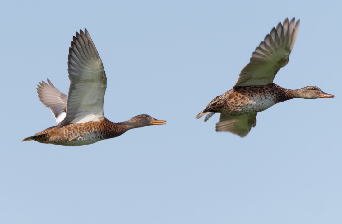 Yesterday at Woolston Eyes the temperature was again pushing up towards 30 centigrade by early afternoon, so an early start was in order. This is the time of highest biomass on the Reserve, as both resident and migrant passerines are feeding thousands of young, moulting adult wildfowl are everywhere, along with masses of young, roosts of gulls and Lapwings are growing in size and the insect population is also at its peak. A raft of 630 Gadwall was in front of the Morgan Hide and another 80 flew over to drop into No.3 bed. Then it was a stroll over to No.4 bed, where our contractor is making steady progress towards completion of the new wetland. Although we have been keeping the sluice gates open to reduce the water levels and facilitate the work, there is still a chain of small shallow pools as well as a larger body of water in the westernmost cell. Small numbers of waders are passing through daily and 3 Common Sandpipers, 3 Little Ringed Plovers and one Green Sandpiper were good to see. Additionally, a female Marsh Harrier was actively hunting, despite the attentions of the mobbing gulls. Perhaps most pleasing was to find another 90 Gadwall, taking the flock size to around 800, which is getting ever closer to the qualification for international importance (1,000). Finishing on No.3 bed, the highlight was the female Kestrel with two fledged young near the Footbridge. I’ve watched adults carrying prey towards the south bank of the bed regularly, without pinning down the nest site, so it was good to prove breeding for a second pair this year. Flight photo of Gadwall Cheers David