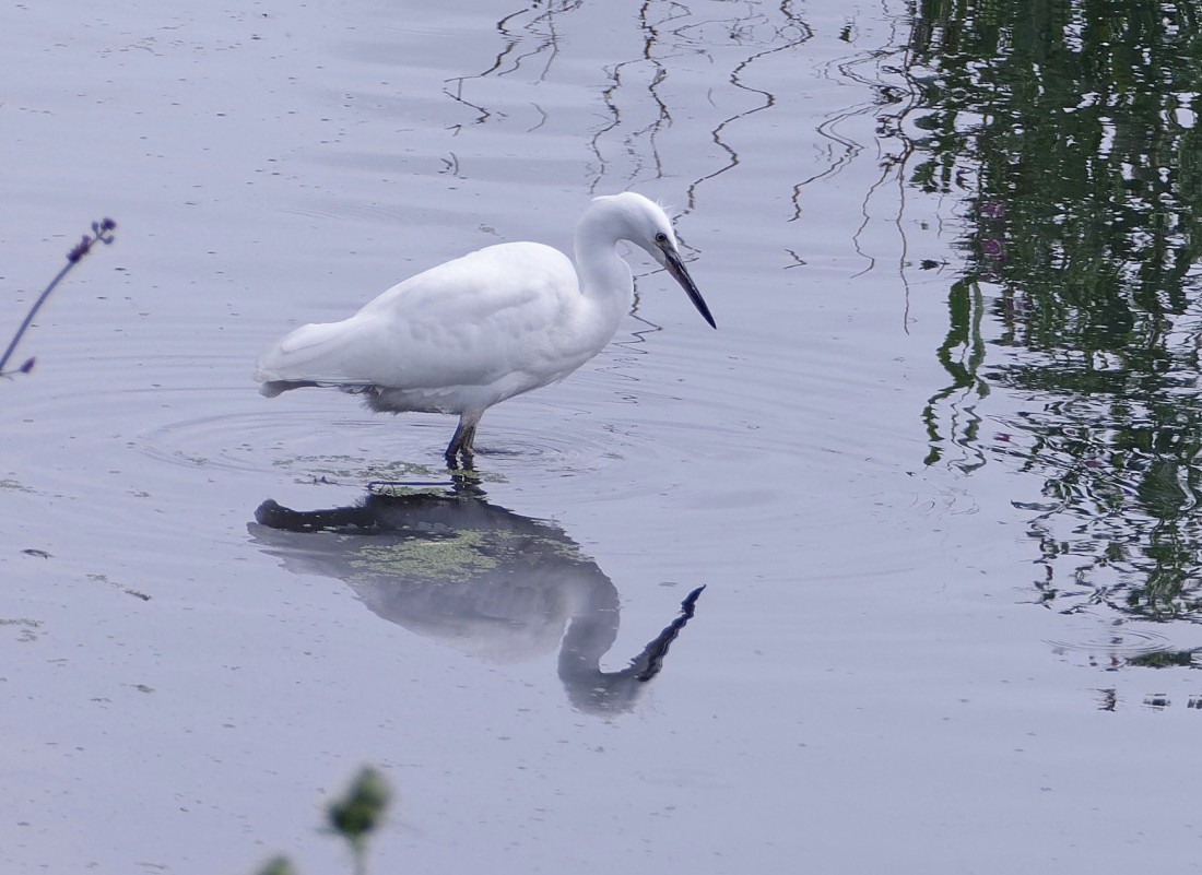 On a warm mid-summer’s day at Woolston Eyes, you are reminded why the Reserve is so good for breeding and passage passerines, with so many hoverflies, bees, beetles and other insects thronging on the the profusion of wildflowers. As well as being fascinating creatures in their own right, they all make a very nutritious snack for a passing warbler. In front of the Morgan Hide, Garden Warbler, Reed Warbler, Sedge Warbler, Willow Warbler, Chiffchaff and Whitethroat were all feeding at close range on the insect-rich flowers of Common Hogweed. The larger birds also added to the interest, with a Little Egret arriving to feed around the end of the Morgan Hide scrape. while a female Marsh Harrier actually landed on the scrape before launching off on a successful hunt over the reed bed. Two Common Terns dropped in and took exception to the harriers’s presence, mobbing it persistently, while a distant Hobby was hunting close to a group of feeding Swifts. This is also the time of year when our moulting flock of Gadwall reaches a size of national importance (600) and even starts to approach the figure for international importance (1,000). At lunchtime something caused a disturbance in the reeds, bringing all of the Gadwall out of cover enabling a pretty accurate count of 680 to be made, with the prospect of more to come. Record shot of the Little Egret Cheers David (with David Spencer).