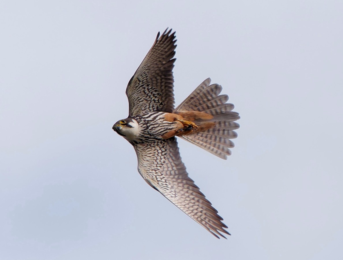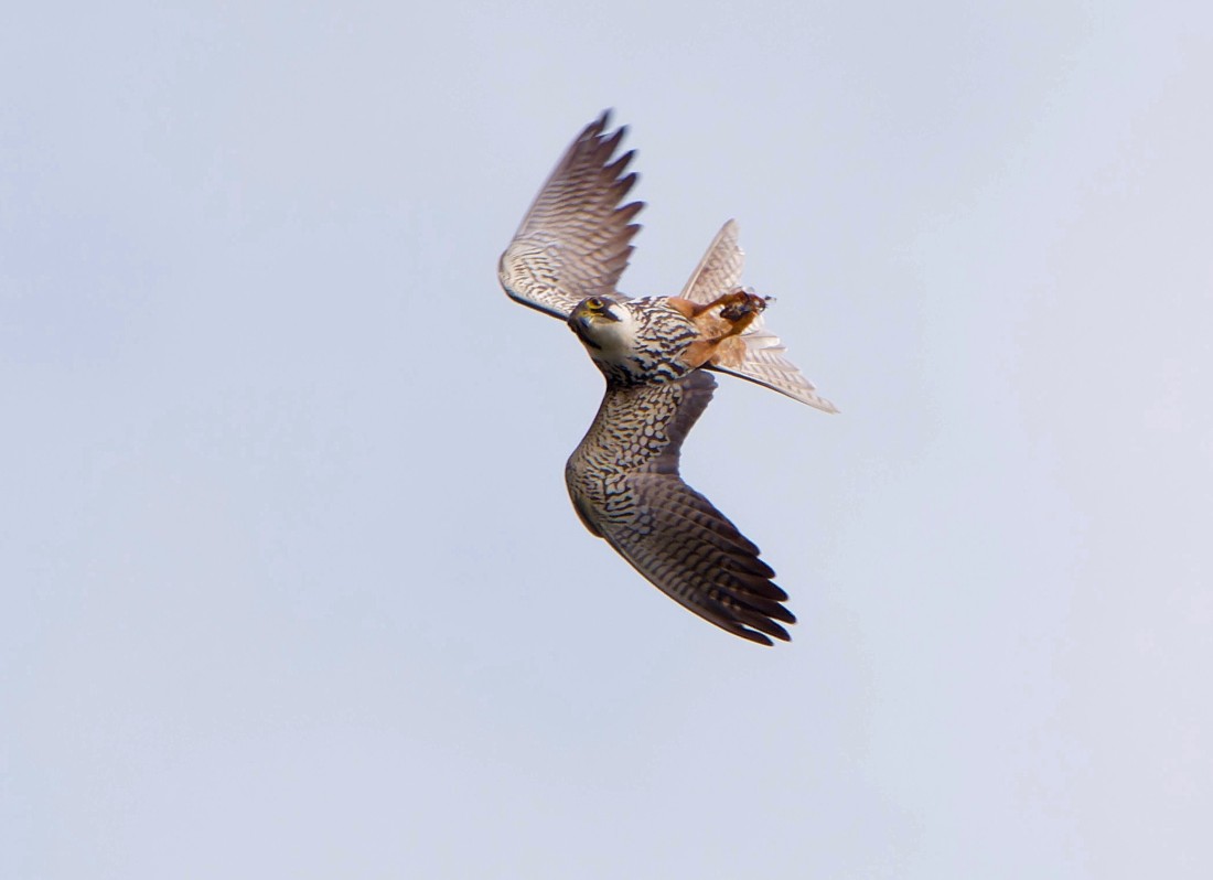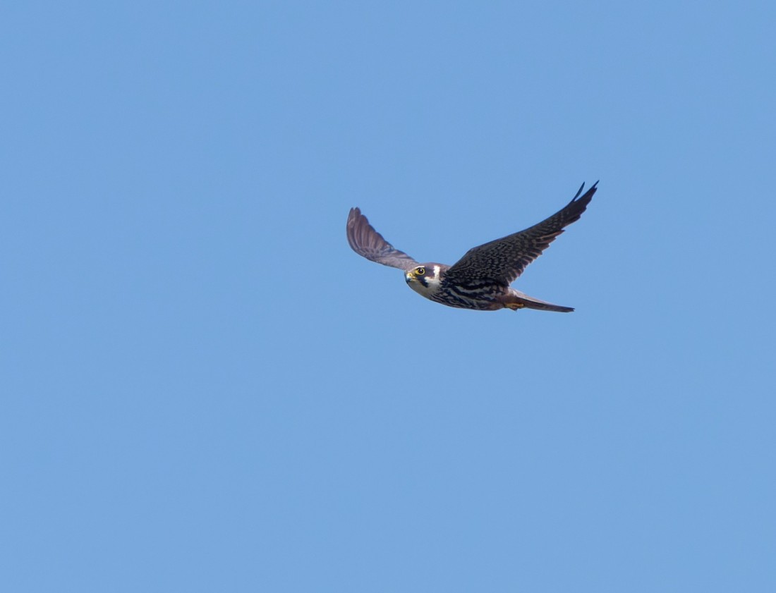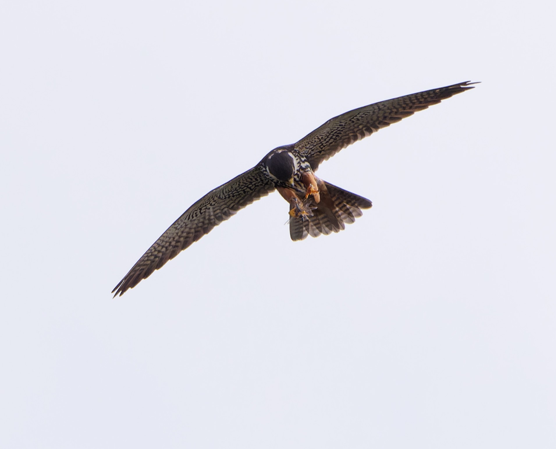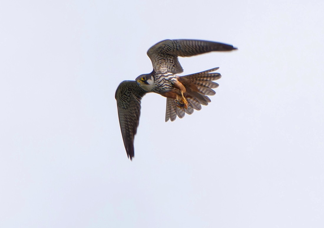 A fiery dawn led on to a warm day with a light south-easterly breeze and some excellent sightings. Early on, singles of Green Sandpiper and Black-tailed Godwit were in front of the Morgan Hide, while their distinctive high-pitched whistle drew our attention to a flock of six Wigeon. Then it was down to No.1 bed and while the others were watching dragonflies, I did a circuit of the flower and seed-rich stony plain which surrounds a network of newly created pools. Counts included: 5 Yellowhammers,10 Skylarks, 47 Meadow Pipits, 100 Linnets, 55 Stock Doves and 8 Snipe. Back in the Morgan Hide, we were treated to a bit of a raptor-fest, with a family of four Hobbies (2 adults and 2 juveniles) hawking for dragonflies, which they eat on the wing, right in front of the hide. At the same time 3 Sparrowhawks (2 adults and a juvenile) were zipping around the feeding stations, trying to snatch one of the scores of feeding finches. Photo of a Hobby Cheers David (with Helen Wynn, Brian Baird, Dave Steel, Al Warford and Sue Haddock)