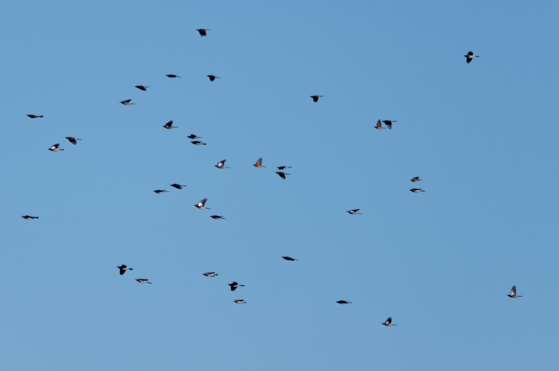 Another superb morning for visible migration from No.3 bed. It was a day with continental thrushes passing through the north-west in large numbers. While we’ve already had some excellent counts of Redwings, Fieldfares have been unusually late in arriving - until today. By the end of the morning 2,500 Fieldfares and 1,900 Redwings had passed over, with many more dropping in to feed around the bed. With so many thrushes around it was no surprise when Dan Owen picked out a late Ring Ouzel with feeding Redwings. Equally, in recent years large thrush movements have regularly coincided with the arrival of a male Merlin, which likes to hunt Greenfinches at the Morgan Hide feeding station and the same held true today. Unusually for us, Starlings were moving on the same vector as the thrushes, suggesting an influx from Eastern Europe. Late autumn/winter can see millions arrive from as far as Siberia and in all, 1,050 passed over. It was good for finch movement, too, with 60 Bramblings and 100 Siskins, quite a few of which dropped in around the bed. Other counts of note included 25 Skylarks, 580 Pink-footed Geese and 1,500 Woodpigeons. An indication of the scale of the recent Woodpigeon movements came from Portskewett, in Gwent, yesterday, when 194,000 flew south-west over the morning! Record shot of one of the many thrush flocks, Cheers David (with Dan Owen)