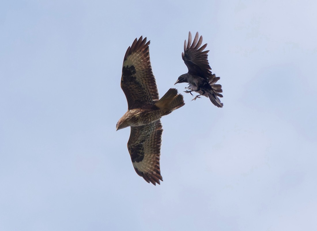 Today it was a combination of a visible migration session on No.1 bed combined with the WeBS Count at Bollin Point. 7 Jack Snipe, 5 Woodcocks and 4 Common Snipe were around the bed, while 5 Golden Plover were with the Lapwing flock on fields to the north. Continental thrushes were moving in good numbers, along with a few Pink-footed Geese and we ended up with 1,750 Fieldfares, 1,600 Redwings and 400 Pink-feet by lunchtime. At Bollin Point 3 Goldeneyes and 3 Wigeon were among the 500 or so commoner water-birds loafing on the Ship Canal. The most memorable spectacle, however, came when a large juvenile female Peregrine flushed 2 Grey Partridges 150 Pink-feet, 50 Stock Doves and around 400 Corvids (mainly Rooks and Jackdaws) from the stubbles to the south. Photo of a Carrion Crow mobbing a Buzzard. Cheers David (with Dave Steel and Helen Wynn)