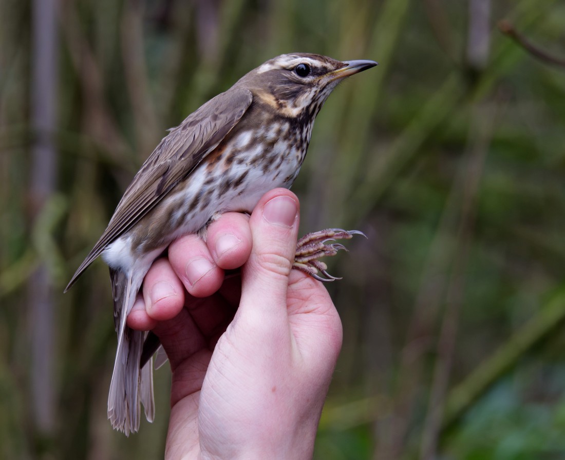 It was an unseasonally warm autumn morning, with plenty of insects on the wing. Pink-footed Geese were on the move from first light, with 13 small skeins, totalling 1,100, all heading for the east coast. The Morgan Hide feeding station pulled in three Bramblings, along with scores of Greenfinches, Chaffinches and the odd Willow Tit. The Green Sandpiper, which visited the Morgan Hide scrape several times, was wearing a colour ring and was almost certainly from the No.3 bed ringing programme. Small groups of Redwings were also occasionally dropping in, along with the odd Fieldfare. A mid-morning walk onto No.4 bed produced a nice couple of drake Pintails, a handsome duck which was once common on the Reserve but has become scarce as the numbers wintering on estuaries in the north-west have declined dramatically. Finally, to cap a lovely morning, a Marsh Harrier arrived scatter all the wildfowl, including over 100 Shovelers and 250 Teal. Photo of a Redwing, ringed by Dan Owen Cheers David (with Helen Wynn, Brian Baird and David Fairclough)